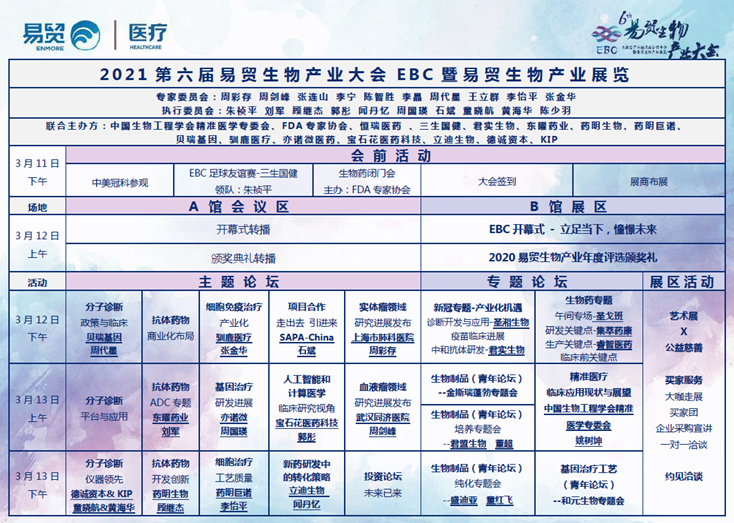 2021第六屆易貿(mào)生物產(chǎn)業(yè)大會(huì)EBC將于3月11-13日在蘇州國(guó)際博覽中心隆重召開。EBC 2020年參會(huì)人數(shù)2724人,2021年將突破4000人規(guī)模,參會(huì)人群覆蓋創(chuàng)業(yè)者、科學(xué)家、臨床醫(yī)生、投資人和供應(yīng)商等。同期開展的易貿(mào)生物產(chǎn)業(yè)展覽,將有超過(guò)200家儀器、耗材、服務(wù)等供應(yīng)商展出,會(huì)+展聯(lián)動(dòng)的EBC,已成為國(guó)內(nèi)外生物產(chǎn)業(yè)高層交流與合作的標(biāo)桿平臺(tái)。