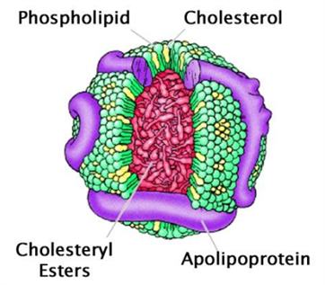 脂蛋白由脂質(zhì)和蛋白質(zhì)以非共價(jià)作用結(jié)合而組成,其外層是磷脂(phospholipids)、未酯化的膽固醇(cholesterol)和蛋白質(zhì),核心是中性脂質(zhì),包括膽固醇酯(cholesteryl esters)和三酰基甘油(TAG)。載脂蛋白(Apolipoprotein)是一種蛋白質(zhì),它與其他親水脂性分子一起圍繞在脂質(zhì)周?chē)?/span>共同構(gòu)成脂蛋白。這種結(jié)構(gòu)讓脂蛋白能夠通過(guò)水基循環(huán),特別是血液和淋巴循環(huán)進(jìn)行體內(nèi)運(yùn)輸。