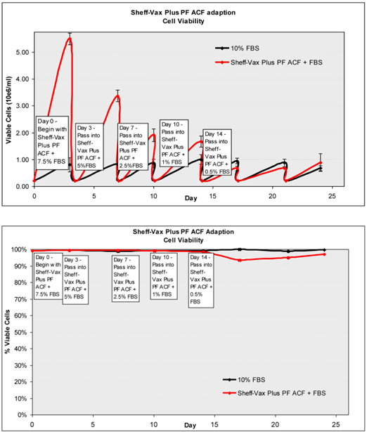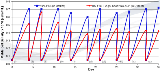 每次傳代逐步減少FBS,同時添加Sheff-Vax ACF,在相同培養(yǎng)時間內(nèi),無血清組細(xì)胞生長密度可達(dá)到10% FBS組細(xì)胞密度峰值的一半,延長培養(yǎng)時間還可以獲得更高的細(xì)胞密度(見下圖)。