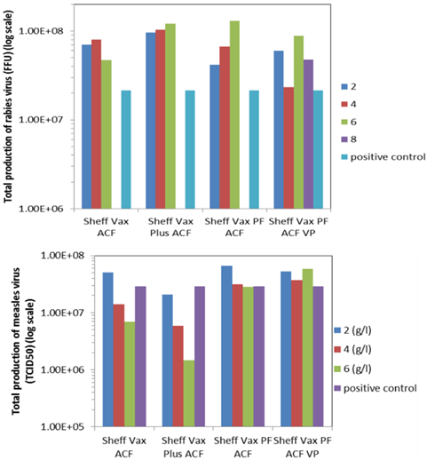 分別在培養(yǎng)狂犬病毒和麻疹病毒的細(xì)胞培養(yǎng)基中添加不同的Sheff-Vax產(chǎn)品,與對照組相比均能有效提升病毒生產(chǎn)滴度。在病毒增殖階段添加Sheff-Vax Plus PF ACF VP對病毒滴度也有顯著的提升(見下圖)。