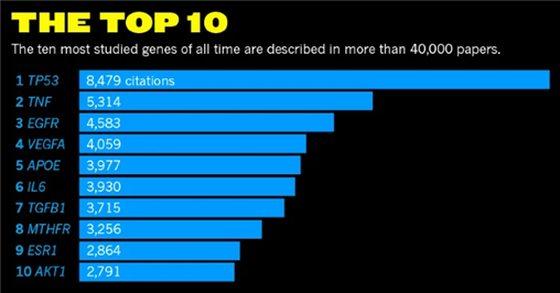 科學(xué)家們在癌癥領(lǐng)域做了大量的研究,目前的主要策略是降解突變體p53,或者改造突變體p53的蛋白折疊,使其恢復(fù)野生型p53的構(gòu)象和功能。在藥物研發(fā)上,想要抑制一個(gè)蛋白的功能容易,想恢復(fù)一個(gè)蛋白的功能卻很難,所以,到目前為止仍沒有一款靶向p53的抗癌新藥上市,該領(lǐng)域藥物開發(fā)已成為人們最關(guān)注的靶點(diǎn)之一,在Nature雜志2017年的一項(xiàng)統(tǒng)計(jì)中,TP53基因以絕對(duì)優(yōu)勢(shì)位列過去幾十年最熱門研究基因榜第一名。