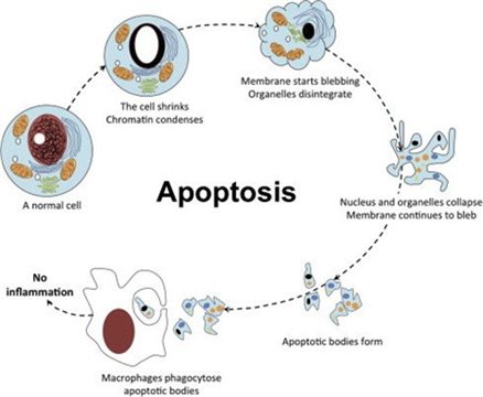 凋亡的特征具有明顯的形態(tài)變化以及特定caspase和線粒體控制通路的激活。凋亡細胞出現(xiàn)細胞體積縮小,與周圍細胞脫離,然后細胞質(zhì)密度增加,通透性改變,染色質(zhì)濃縮和核碎裂,并顯示出稱為膜起泡的典型變形的膜,膜內(nèi)側(cè)磷酯酰絲氨酸外翻到膜表面,胞膜結(jié)構仍然完整,無內(nèi)容物外溢,不引起周圍的炎癥反映。膜起泡可導致在垂死細胞邊緣形成小囊泡,稱為凋亡小體。凋亡小體可迅速被周圍的吞噬細胞吞噬。凋亡可以通過內(nèi)在或外在通路觸發(fā),內(nèi)在通路可以通過細胞應激、DNA損傷、發(fā)育信號、存活因子缺失被激活,外在通路則是通過檢測到來自其他細胞的細胞外死亡信號來觸發(fā)的。