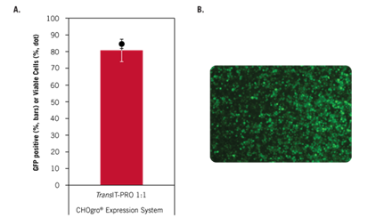 圖1. 單獨使用Mirus CHOgro? High Yield Expression系統(tǒng)中的轉(zhuǎn)染試劑(TransIT-PRO? 轉(zhuǎn)染試劑),也有著高水平的轉(zhuǎn)染效率。