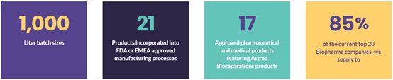 英國Astrea Bioseparations于1987年成立,公司前身是Affinity Chromoatography Ltd,其從英國劍橋大學(xué)獨立出來專注于吸附填料的研發(fā)和生產(chǎn)。Astrea Bioseparations 公司兩大核心專利技術(shù)(產(chǎn)品)Mimetic ligand® 和PuraBead® 是公司產(chǎn)品的基石,迄今為止已有21個上市產(chǎn)品(FDA/EMA) 使用 Astrea Bioseparations公司的產(chǎn)品用于商業(yè)化生產(chǎn),其中不乏跨國公司和新興生物技術(shù)公司。