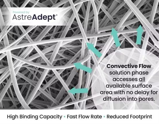 近年來,隨著CGT領(lǐng)域的興起,病毒載體的純化面臨著諸多技術(shù)瓶頸,Astrea Bioseparations 致力于開發(fā)一種用于病毒載體高效純化的新型生物分離材料AstreAdept®。AstreAdept ®是一種靜電紡絲復(fù)合納米纖維層析膜,具有較大的開放結(jié)構(gòu),幾乎可以瞬時結(jié)合大目標(包括病毒載體)到更大的結(jié)合表面積。