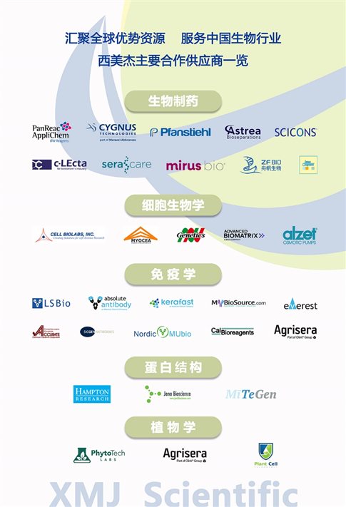 北京西美杰科技有限公司(Beijing XMJ Scientific Co.,Ltd,以下簡稱西美杰)于2006年由留美歸國生物領(lǐng)域?qū)I(yè)人才創(chuàng)辦,是一家集進口試劑銷售、技術(shù)服務(wù)與合約開發(fā)于一體的高科技公司,旨在為生命科學(xué)發(fā)展提供一流的產(chǎn)品與服務(wù)。
