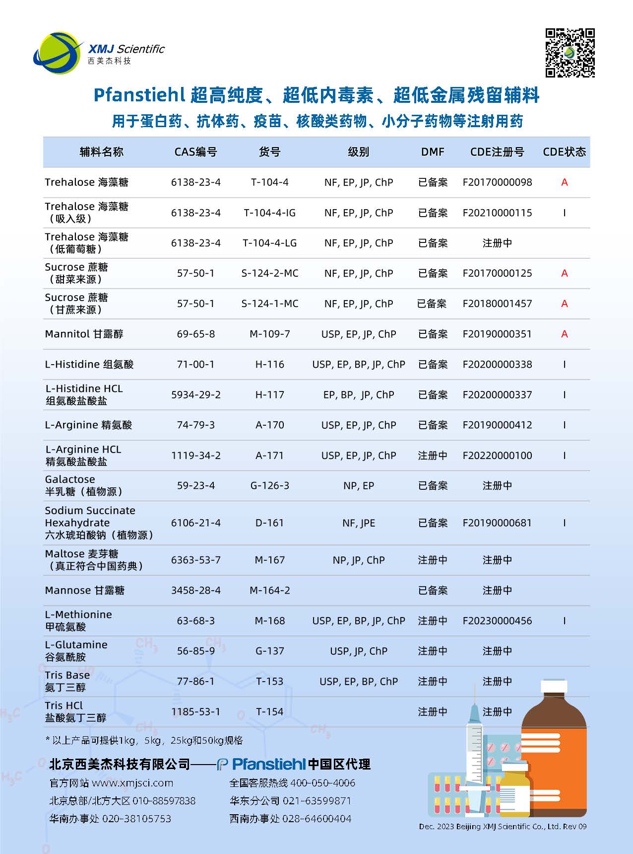Pfanstiehl Inc.成立于1919年, 公司總部位于美國(guó)芝加哥市北郊沃吉根工業(yè)區(qū),是美國(guó)老字號(hào)企業(yè)之一,也是一家真正的cGMP生產(chǎn)商。作為一家有著百年基業(yè)和沉淀的公司,Pfanstiehl Inc立志將產(chǎn)品質(zhì)量做到極致,是全球生物制藥領(lǐng)域超純糖類、氨基酸類以及其他尖端分子的領(lǐng)先生產(chǎn)商,迄今已服務(wù)全球蛋白藥、抗體藥、疫苗、mRNA及核酸類藥物等領(lǐng)域100年以上。Pfanstiehl Inc. 超高純度、超低內(nèi)毒素,超低金屬離子含量的輔料制劑產(chǎn)品,全面的技術(shù)和法規(guī)審計(jì)支持,真正的cGMP質(zhì)量控制體系,接受FDA的定期監(jiān)察審計(jì)等都被國(guó)際知名生物制藥公司所認(rèn)可。Pfanstiehl Inc.是全球超高純度、超低內(nèi)毒素、超低金屬離子含量等注射級(jí)糖類的領(lǐng)先制造商,產(chǎn)品生產(chǎn)均參照ICHQ7質(zhì)量體系。自2015年進(jìn)入中國(guó)市場(chǎng)以來,Pfanstiehl Inc.已獲得13個(gè) CDE登記號(hào),主要產(chǎn)品含括海藻糖,蔗糖,D-甘露醇,組氨酸,組氨酸鹽酸,精氨酸,精氨酸鹽酸,琥珀酸鈉,甲硫氨酸等,其中海藻糖F20170000098,甘蔗源蔗糖F20180001457和甜菜源蔗糖F20170000125, D-甘露醇F20190000351的CDE號(hào)均已激活。 Pfanstiehl Inc.于2023年又重磅推出注射級(jí)Tris和Tris HCl,這將是全球高質(zhì)量的Tris和Tris HCl。作為一家有著百年歷史的企業(yè),Pfanstiehl Inc. 也在持續(xù)投資,不斷擴(kuò)充產(chǎn)品管線和擴(kuò)大生產(chǎn)產(chǎn)能,以滿足和支持全球生物制藥行業(yè)的快速發(fā)展,特別是更好的助力中國(guó)生物制藥的發(fā)展需求。