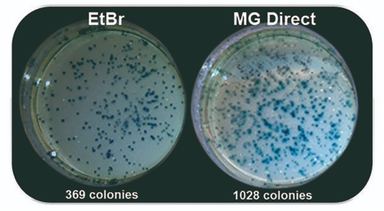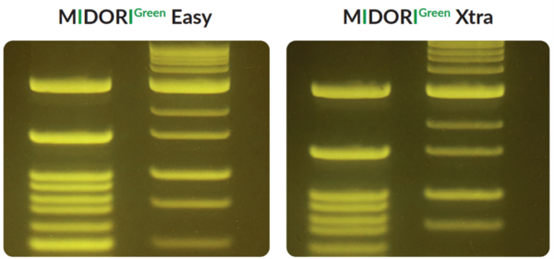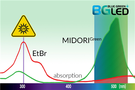 紫外光與EtBr染色至今仍一起被用于分子生物學(xué)實(shí)驗(yàn)室中檢測(cè)核酸。然而紫外光譜會(huì)導(dǎo)致DNA樣品的修飾和降解,30秒的紫外線曝光足以大幅降低克隆效率。藍(lán)/綠LED在470 nm - 520 nm處發(fā)出安全可見光,這種光譜對(duì) DNA 沒有破壞性,與紫外光相比,DNA完整性和克隆/測(cè)序效率完全不受影響,即使在長(zhǎng)時(shí)間的光照下也是如此。MIDORIGreen系列核酸染料經(jīng)過優(yōu)化,可在紫外光或藍(lán)/綠光激發(fā)時(shí)獲得更亮的信號(hào),同時(shí)也兼容紫外光。