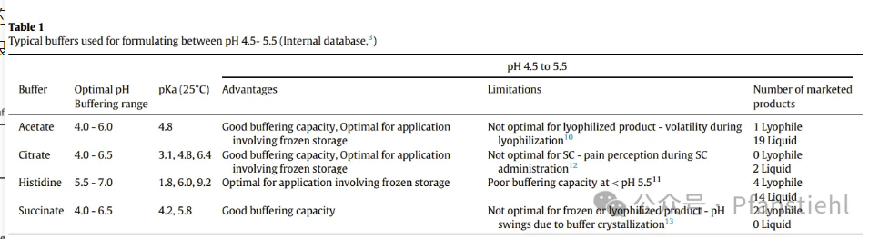 盡管在液體和凍干產(chǎn)品中,組氨酸在pH 5.5至6.5的范圍內(nèi)都占據(jù)主導(dǎo)地位,但如果目標(biāo)pH值在4.5至5.5之間,我們依然還有另外三種緩沖液可選,即醋酸鹽、檸檬酸鹽和琥珀酸鹽。這些緩沖物質(zhì)存在某些固有的挑戰(zhàn),阻礙了它們?cè)陟o脈和皮下給藥以及液體和凍干劑型方面的廣泛使用。而組氨酸的pKa值為6,在pH<5.5時(shí)緩沖性較差,因此在4.5至5.5的pH范圍內(nèi)應(yīng)用有限。雖然醋酸鹽在此范圍內(nèi)具有良好的緩沖能力,但其易揮發(fā)和冷凍干燥過程中溶劑的過度損失是其應(yīng)用相關(guān)的潛在挑戰(zhàn)。檸檬酸鹽緩沖制劑在皮下應(yīng)用中使用有限,原因是在皮下注射期間存在壞死的風(fēng)險(xiǎn)。琥珀酸鹽在pH4.5至5.5之間提供了強(qiáng)大的緩沖能力,但由于琥珀酸鹽結(jié)晶影響產(chǎn)品穩(wěn)定性而導(dǎo)致pH值劇烈波動(dòng)的風(fēng)險(xiǎn),通常避免其用于冷凍或凍干的應(yīng)用。以下表格總結(jié)了在注射制劑中使用這四種緩沖液的局限性[1]。