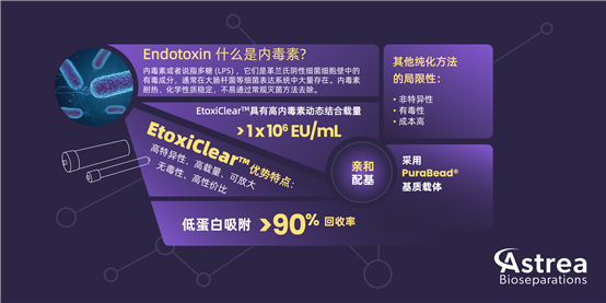 本文將推薦一款來(lái)自英國(guó)Astrea Bioseparations的Etoxiclear?層析介質(zhì),它是一種高性能、非離子交換、合成的親和層析吸附劑,可經(jīng)濟(jì)高效地去除內(nèi)毒素,支持GMP生產(chǎn),有凝膠和一次性預(yù)裝柱兩種形式產(chǎn)品,滿(mǎn)足不同的工藝需求。