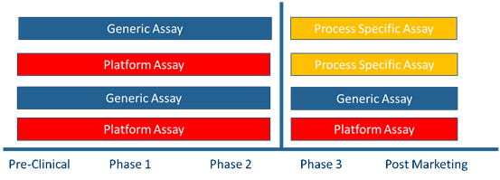 美國(guó)藥典USP<1132>和歐洲藥典EP2.6.34. HOST-CELL PROTEIN ASSAYS將HCPs檢測(cè)方法分為:商業(yè)化試劑盒、產(chǎn)品/工藝專屬性方法和平臺(tái)化方法。并指出在產(chǎn)品開發(fā)的不同階段,推薦采用不同的ELISA試劑盒用于HCPs的檢測(cè)。